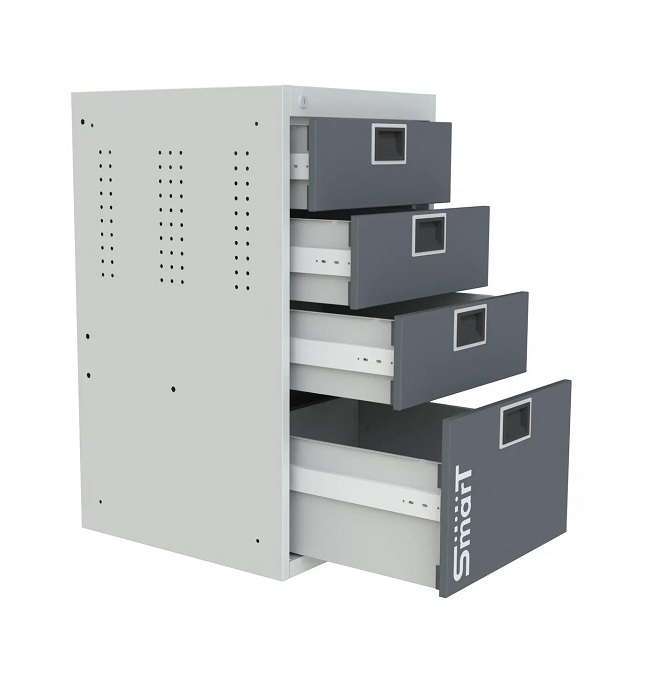 В комплектацию верстака входит: столешница 1280 SMART, тумба SMART 4, тумба SMART 1-1, тумба-пенал SMART. Столешница выполнена из фанеры 27 мм со стальной окрашенной накладкой 1,2 мм. Тумба SMART 4 комплектуется 4 выдвижными ящиками. Выдвижные ящики оборудованы телескопической системой полного выдвижения ящиков с фиксацией в закрытом состоянии (50000 циклов). Тумба SMART 1-1 комплектуется одной дверью, одним выдвижным ящиком и регулируемой по высоте полкой. Тумба-пенал SMART выдвигается на четырех телескопических направляющих и предназначена для хранения крупногабаритных инструментов и аксессуаров. Все тумбы закрываются ключевым цилиндровым замком. Секретность замка 2000 комбинаций (2 ключа в комплекте). Внутренние стенки дверей имеют универсальную перфорацию для размещения навесных элементов. Шаг квадратной перфорации (10 мм) - 38х38 мм, круглой (7 мм) - 25х38 мм. Возможна смена стороны открывания двери тумбы. Цвет верстака: корпус тумб - серый Ral 7035, столешница, двери тумб, лицевая панель ящиков - антрацит Ral 7016. Поставляется в разобранном виде.