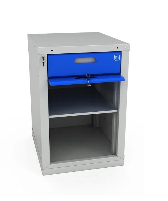 Тумба Woker 02-1 имеет одну регулируемую по высоте полку с шагом 50 мм. Полка тумбы установлена на стальные салазки, которые позволяют выдвигать полку на себя на 70% для облегчения разгрузки/погрузки. Ящик комплектуется противоскользящим ковриком и набором наклеек с пиктограммами для маркировки содержимого ящика. Полезный размер ящика: (ШхГ) 459х612 мм. Дверь тумбы закрывается на цилиндрический ключевой замок со стальной поворотной ручкой, секретность замка 2000 комбинаций. Открывание двери во внутрь тумбы (задвижная дверь).  Цвет: корпус верстака - серый Ral 7035, лицевая панель тумбы Ral 5005