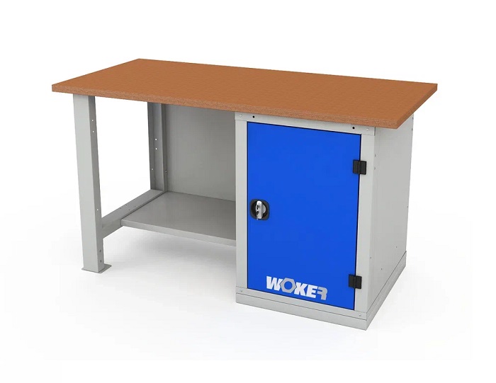 В комплектацию верстака входит: столешница Woker 1500, опора стационарная Woker (нерегулируемая), тумба Woker 01, полка/стенка Woker. Столешница выполнена из шлифованной березовой многослойной фанеры толщиной 30 мм. Снаружи фанера обработана влагостойким антисептиком цвета "красное дерево", что придает фанере повышенную влагостойкость и более темный цвет. Опора изготовлена из цельногнутого стального профиля толщиной 1,5 мм, шириной 80 мм. Полка/стенка выполнена из стального листа толщиной 1 мм. Выдерживает нагрузку -30 кг. Тумба Woker 01 имеет две полки регулируемые по высоте с шагом 50 мм. Полки тумбы установлены на стальные салазки, которые позволяют выдвигать полку на себя на 70% для облегчения разгрузки/погрузки. Дверь тумбы закрывается на цилиндрический ключевой замок со стальной поворотной ручкой, секретность замка 2000 комбинаций. Открывание двери на 180 градусов.
