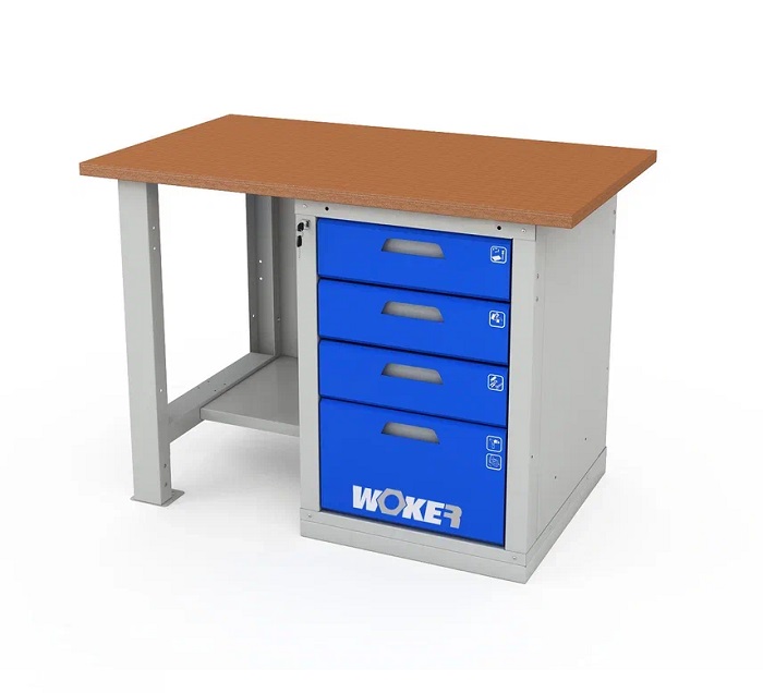 В комплектацию верстака входит: столешница Woker 1200, опора стационарная Woker (нерегулируемая), тумба Woker 01, полка/стенка Woker. Столешница выполнена из шлифованной березовой многослойной фанеры толщиной 30 мм. Снаружи фанера обработана влагостойким антисептиком цвета "красное дерево", что придает фанере повышенную влагостойкость и более темный цвет. Опора изготовлена из цельногнутого стального профиля толщиной 1,5 мм, шириной 80 мм. Полка/стенка выполнена из стального листа толщиной 1 мм. Выдерживает нагрузку -30 кг. Тумба Woker 04 комплектуются 4 выдвижными ящиками (3 средних и 1 большой). Ящики комплектуются противоскользящими ковриками и набором наклеек с пиктограммами для маркировки содержимого ящика. Полезный размер ящика: (ШхГ) 459х612 мм. Тумба закрывается на центральный цилиндрический замок (секретность замка 2000 комбинаций).